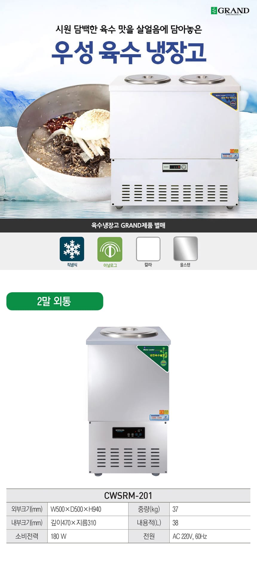 그랜드우성 육수냉장고 렌탈 직냉식 2말 외통 올스텐 60개월